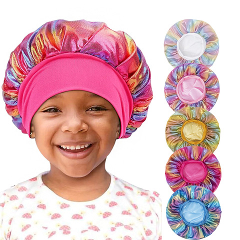 Детские атласные шляпки, эластичная круглая детская шляпка с индивидуальным логотипом для детских волос, Детские лазерные металлические Шелковые Аксессуары для волос